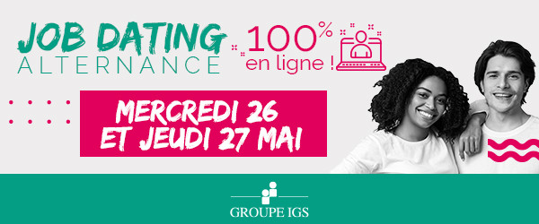 Le Groupe IGS organise la 7ème édition de son Job Dating "Vive l'Alternance" 100% en ligne, accessible depuis chez vous. MERCREDI 26 & JEUDI 27 MAI 2021de 9h à 18h Candidatez au plus vite, en préparant l'une de nos formations et rencontrez nos entreprises partenaires sur le web ! JE CANDIDATE Zoom sur l'édition 2020+ de 40 entreprises présentes sur notre campus 500 jeunes participants - Des centaines de postes pourvus